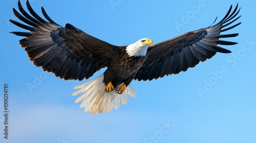 eagle, bald eagle, bird, bird of prey, flying, wing, sky, blue, nature, wild, animal, freedom, power, majestic, predator, wildlife, feather, beak, talon, american, symbol, national, soaring, air, cloud, environment, fauna, conservation, wilderness, habitat, natural, avian, beauty, graceful, strong, powerful