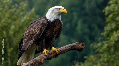 A bald eagle, with striking white head and yellow beak, stands proudly on a branch. The background showcases vibrant greenery, highlighting the eagle's impressive stature in nature