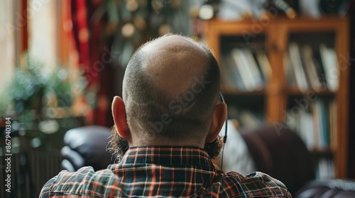 bald, man, beard, behind, sitting, living room, cosy, book, plant, interior, calm, relaxation, thoughtful, indoor, home, comfortable, peaceful, study, shelf, natural light, domestic, serene, backview, casual attire, quiet, tranquil, reading, furniture