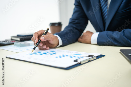 A banker in a suit works at a desk handling loans, analyzing client financial data, providing financial advice, dealing with stocks and the stock market, and studying economic situations.