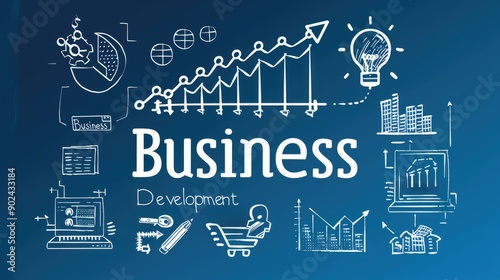 A banner where the text "Business Development" is showcased as a blueprint. with elements of a graph showing upward trends, collaboration symbols, representing the components of business growth