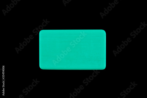 a bar of green blue color soap isolated on a black background close up top view