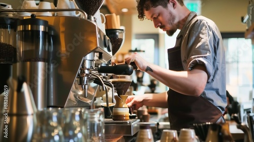 A barista makes coffee in a minimalist coffee shop. barista meticulously making coffee.