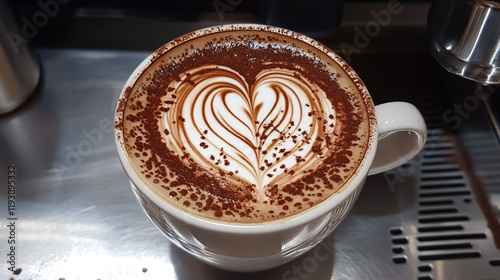 A barista-crafted mocha latte with intricate latte art in the shape of a heart on its frothy surface.