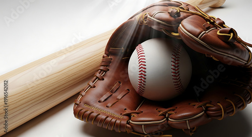 baseball glove, baseball bat, baseball, sports equipment, professional sport, sporting goods, team sport, competitive sport, american culture, white background, studio shot, light rays, sports fan, sporting event, championship, success, dedication, skill, strength, training, challenge, lifestyle, health, fitness, motivation, inspiration, passion, equipment, accessory, closeup, nobody, still life, copy space