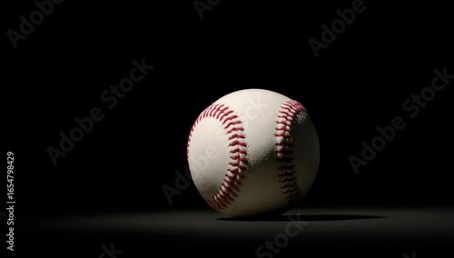 baseball, ball, sport, game, leather, stitched, white, red, dark, black, background, studio, lighting, shadow, illuminated, closeup, object, round, sphere, equipment, playing, competition, classic, american, history, tradition, detail, seam, texture, surface, image, graphic, design, dramatic, contrast, still, life, light, sharpened, quality, photo, picture