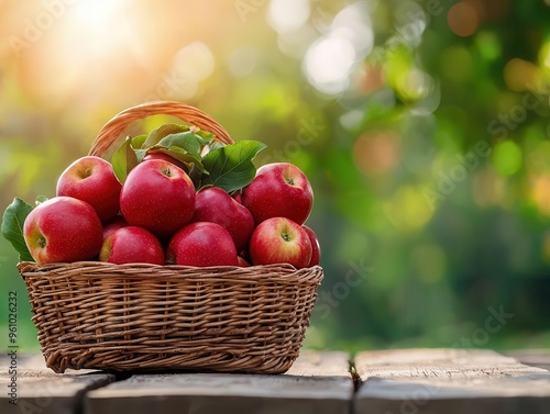 A basket of freshly picked apples sitting on a rustic wooden table, sunlight filtering through the trees, Realism, Warm earthy tones