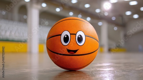 A basketball with a smiley face on it. The ball is orange and has a black stripe