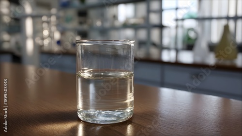 A beaker of clear liquid rests on a wooden table in a softly blurred laboratory background suggesting scientific research