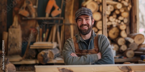 A bearded craftsman smiles warmly in his woodworking shop, surrounded by tools and wood materials