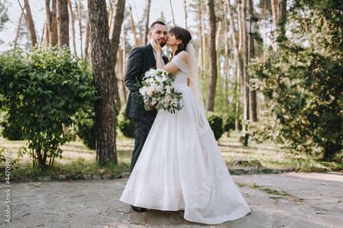 A bearded, stylish groom in a suit and a beautiful bride in a white dress with a bouquet in their hands outdoors in the park tenderly hug. Wedding portrait of newlyweds in love.