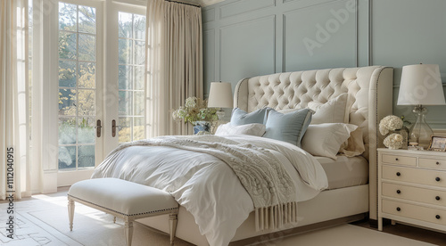 A beautiful, airy bedroom with soft blues, soft greens, and cream tones. The space is tranquil and restful. The upholstered bed has soft curves, is beautifully layered.