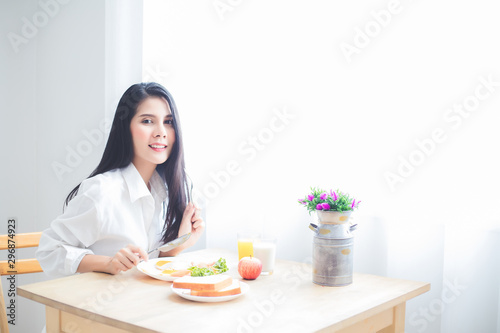 A beautiful Asian woman, a tan, wearing a long-sleeved white shirt and shorts, and on her hand holding a fork and a knife, is eating breakfast in a bedroom at a hotel in Thailand