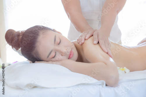 A beautiful Asian woman is comfortably relaxed in a spa shop after the masseuse has massaged her body