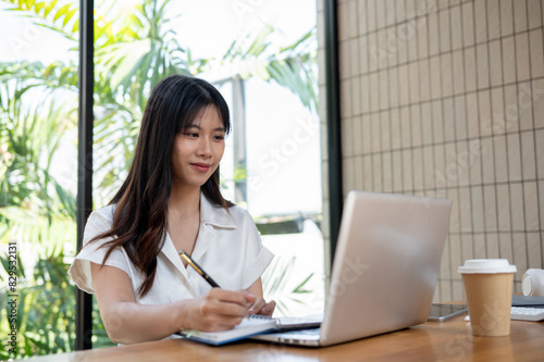 A beautiful Asian woman is listing her ideas in a notebook while browsing the internet on her laptop