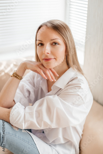 A beautiful blonde girl in a white oversized shirt and blue jeans sits in a bright sunny room on a beige sofa