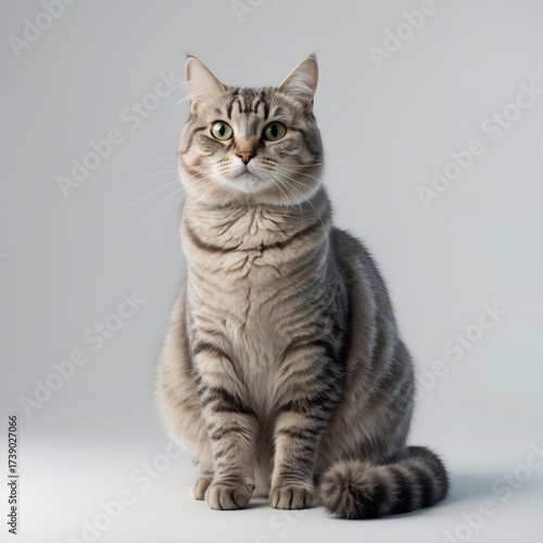 cat, domestic, animal, pet, felino, studio, portrait, realistic, grey, striped, fur, sitting, isolated, white, looking, camera, ear, tail, eye, face, whisker, paw, body, close, up, profile, pattern, texture, detail, background, light, shadow, pose, beautiful, adorable, mammal, creature, small, cute, happy, calm, elegant, gentle, graceful, image, photograph, digital, artwork