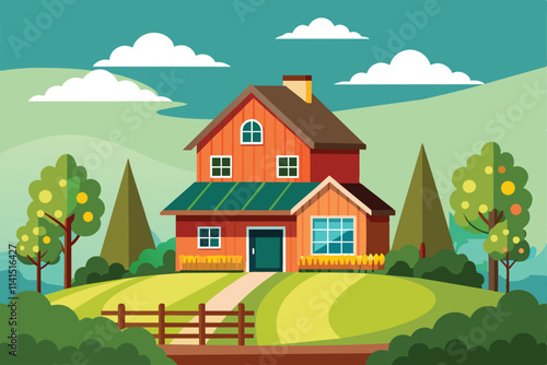 A beautiful farmhouse surrounded by lush greenery and vibrant trees in a peaceful rural setting Farm house Customizable Semi Flat Illustration