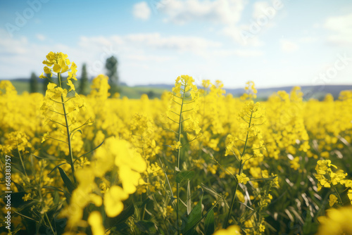 A beautiful field of yellow flowers under a clear blue sky. Perfect for nature lovers and springtime themes