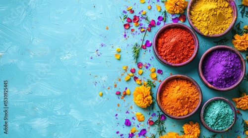 A beautiful flat lay composition of colorful gulal powder in bowls, marigold flowers, and space for text, celebrating Holi traditions