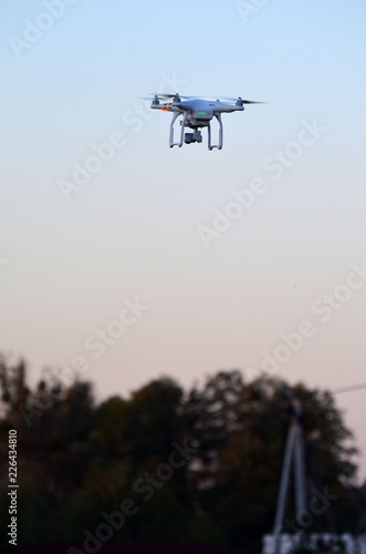 A beautiful flying drone in the evening skies. Aero photography in action.