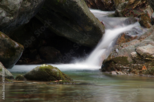 A beautiful forest stream cascading over mossy rocks