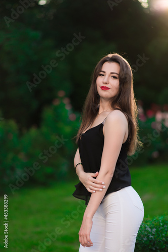 A beautiful girl in white pants and a black sweater posing against a background of flowers. Fashion concept. Lifestyle