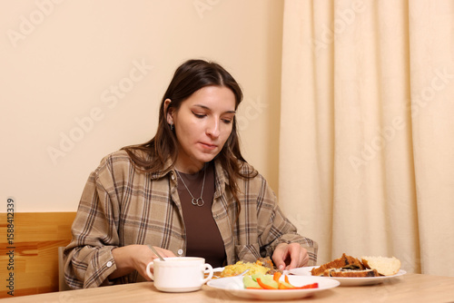 woman, food, table, sitting, lifestyle, drink, happy, meal, girl, breakfast, young, person, beautiful, home, eating, kitchen, female, smile, delicious, eatery, cafes, eat, people, hot drink, fresh, healthy, beverage, adult, caucasian, health, portrait, cup, dinner, enjoy, tea, taro, diet, organic, lunch, croissant, happiness, bread, juice, beauty, glasses, natural