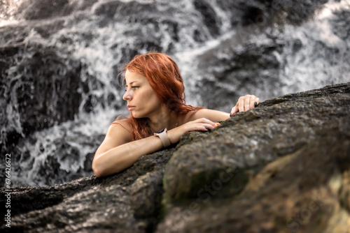 A beautiful girl sits on the stones in the jungle. Girl with red hair. Waterfall in the background.