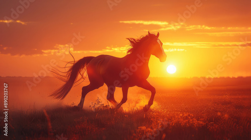 A beautiful horse gallops through beautiful meadows against the backdrop of an amazing sunset. The stallion runs beautifully across the field against the backdrop of a beautiful sunset.