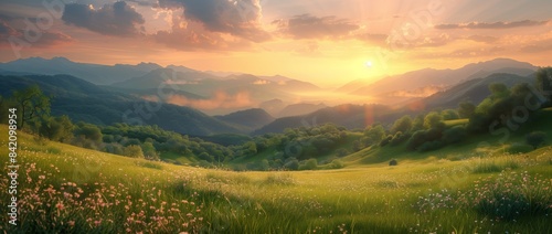 A beautiful landscape of rolling hills covered in lush green grass, with the sun setting over distant mountains