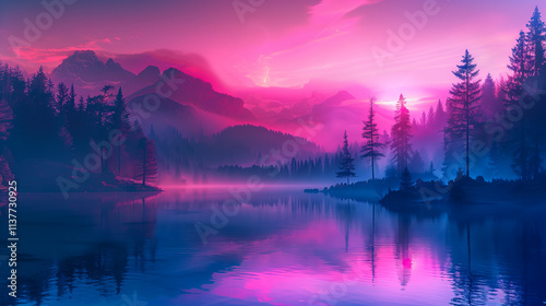 landscape, mountain, tree, lake, foggy, pink, sky, gradient, neon, light, fantasy, photo, art, high, resolution, beautiful, colourful, scenic, nature, serene, tranquil, picturesque, dreamy, environment, outdoors, misty, water, wilderness, natural, vibrant, surreal, aethereal, magical, enchanting, scenery, peaceful, calm, atmospheric, glow, imagination, surrealism, artistry, screensaver, design