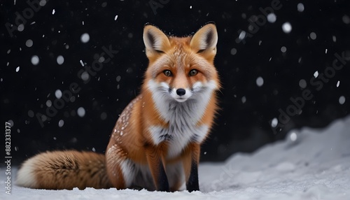 A beautiful little fox with dark black background while snowfall