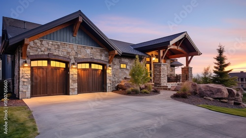 A beautiful luxury custom-built home with a stone and wood exterior, dual garage doors, and a scenic mountain landscape at dusk.