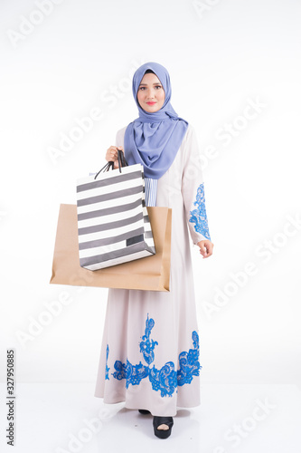 A beautiful Muslim female model in a Asian traditional jubah dress carrying shopping bags isolated on white background. Eidul fitri festive shopping concept. Full length portrait.