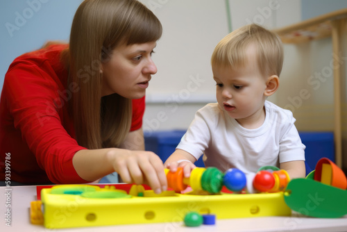 A beautiful occupational therapist working with a child patient on sensory integration, using various sensory activities, generative ai