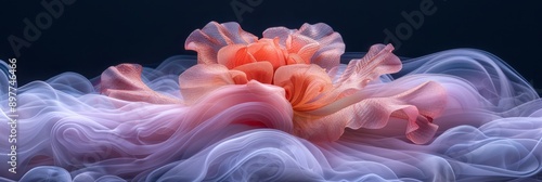 A beautiful pink flower surrounded by swirling ethereal smokey clouds in a surreal and captivating ambiance