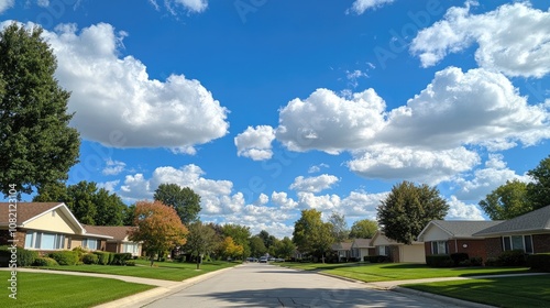 a beautiful residential neighborhood with modern houses, green lawns, and clean roads. The sky is clear and blue