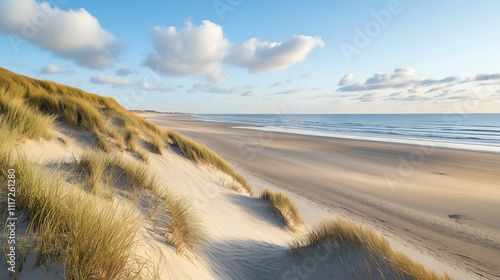 A beautiful sandy beach on the ocean coast, the sand dunes are overgrown with green bushes.