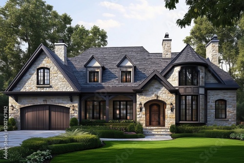 A beautiful stone Tudor style house with a steep roof, large windows, and a charming front porch. The landscape features well-maintained lawns and shrubs, creating an inviting atmosphere.