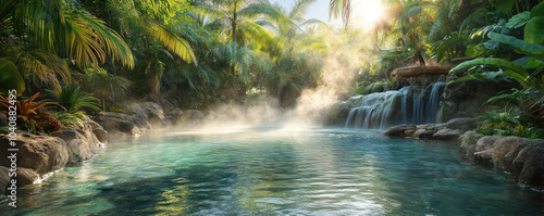 A beautiful tropical forest with a waterfall and a small pond. The water is calm and clear, and the sun is shining through the trees. The scene is peaceful and serene