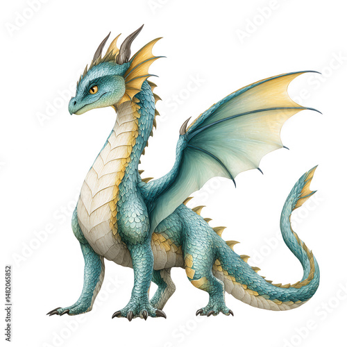 dragon, fantasy, creature, mythical, cute, cartoon, illustration, animal, fairy tale, character, art, drawing, watercolor, beast, legend, reptile, isolated, design, graphic, tale, imaginary, wing, spike, turquoise, gold, vibrant, young, magical, childish, innocence, friendly, adorable, render, studio, story, artwork, mythology, scale, nobody, alone