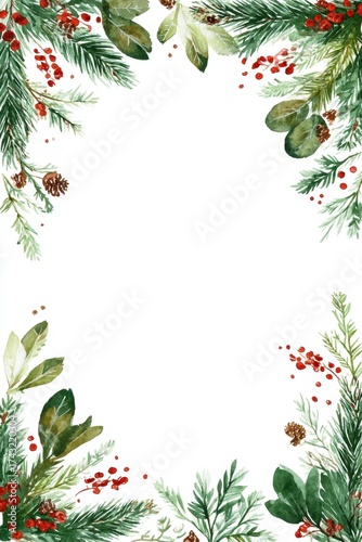 A beautiful watercolor border featuring green foliage, red berries, and pinecones, perfect for festive designs or holiday-themed stationery.