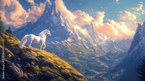 unicorn, white, fantasy, mountain, nature, landscape, sky, cloud, peak, snow, blue, green, grass, tree, sunlight, light, hill, ridge, vale, majestic, wild, beautiful, scenic, peaceful, serene, magical, mystical, adventure, travel, explore, journey, dream, wonder, freedom, hope, strength, elegant, powerful, mythical, creature, fairy tale, forest, rock, horizon