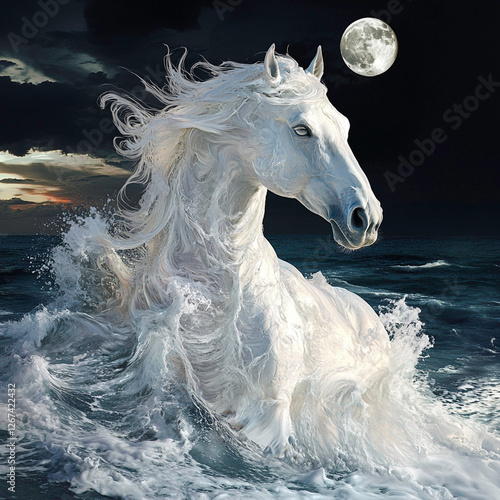 closeup, closeup, white horse, horse, white, wild, animal, landscape, night, moon, wave, wave