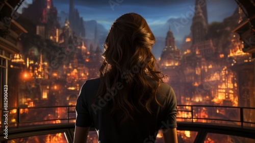 A beautiful woman in a dress, seen from the back, standing in front of slot machines in a casino.