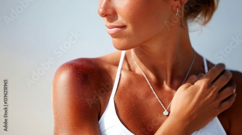 A beautiful woman shows off her tanned shoulder with a silver necklace under the sunlight.