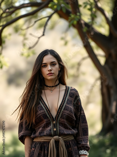 woman, portrait, beautiful, brunette, bohemian, dress, stylish, fashion, long hair, tree, nature, outdoors, pretty, attractive, elegant, jewellery, necklace, earring, choker, gold, summer, natural, daylight, look, face, eye, posing, brown, patterned, clothing, style, peaceful, serene, calm, artistic, vogue, editorial, portraiture, aesthetic, sunlight, light, composition, casual attire, lifestyle, confident, serious