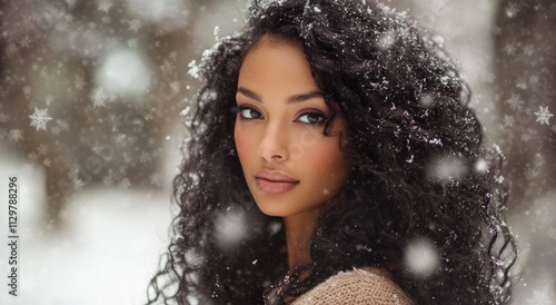A beautiful woman with long, curly hair, snowflakes in her flowing locks, snow falling around her