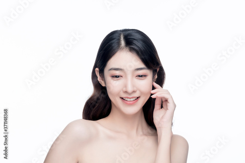 woman, beautiful, cosmetic, beauty, chinese, clean, natural, smile, smiling, youthful, pretty, female, lady, 20s, 30s, asian, asia, grace, face, foundation, make up, skincare, skin, bare skin, white, background, closeup, china, japanese, korean, bodycare, pure, skincare, spa, isolated, cosmetic, brunette, model, cute, closeup, bare shoulder, portrait